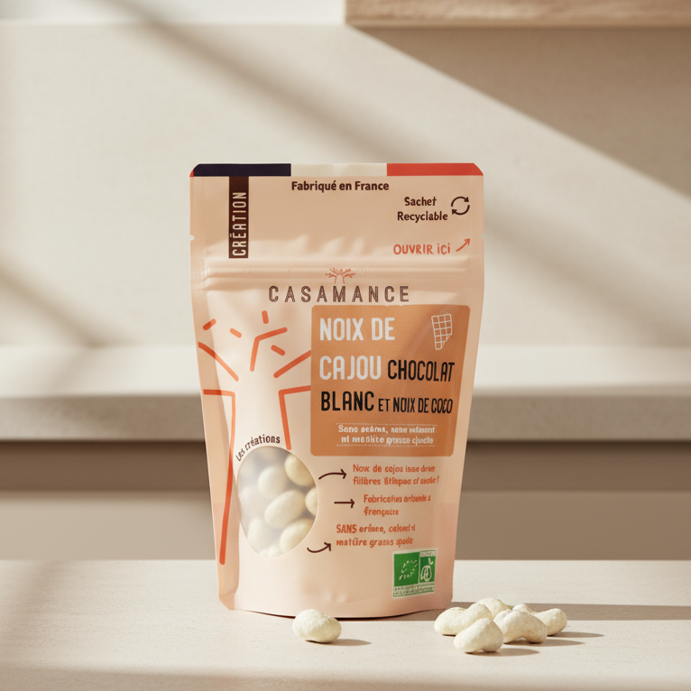 La noix de cajou est enrobée d’une généreuse couche de chocolat blanc et enfin saupoudrée de sucre glace, pour un rendu irrésistible. Sans colorant, sans arôme artificiel.